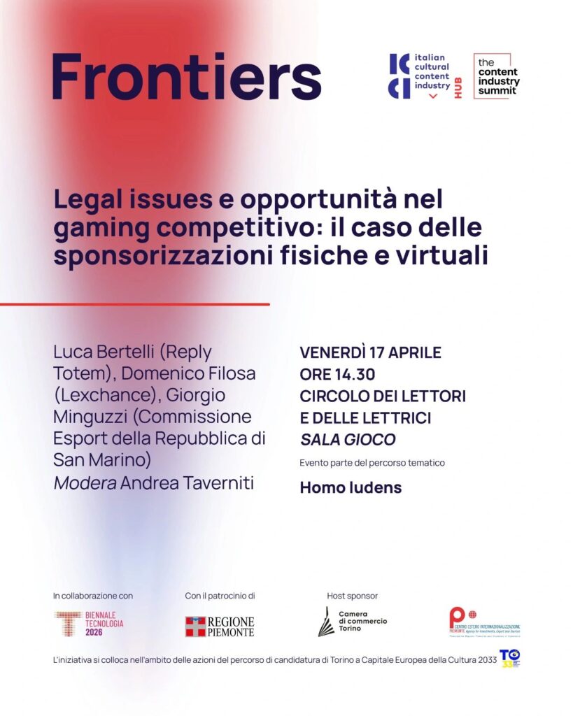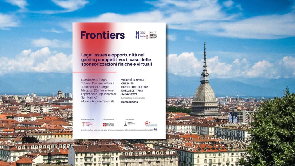 In occasione di Frontiers, ospitato presso il Circolo dei Lettori di Torino, si è svolto il panel dal titolo “Legal issues e opportunità nel gaming competitivo: il caso delle sponsorizzazioni fisiche e virtuali”.